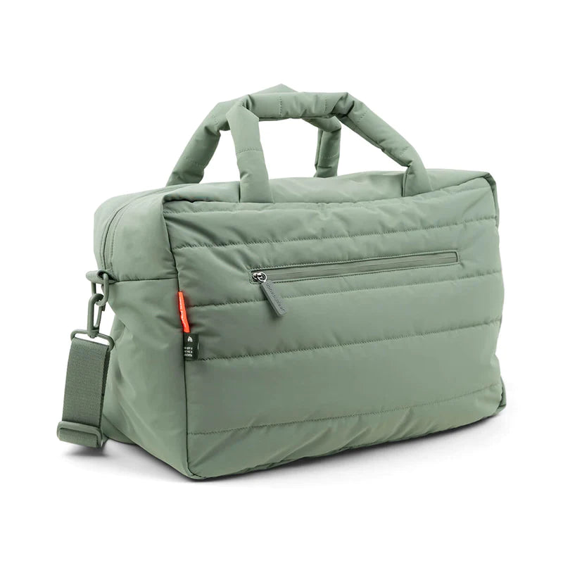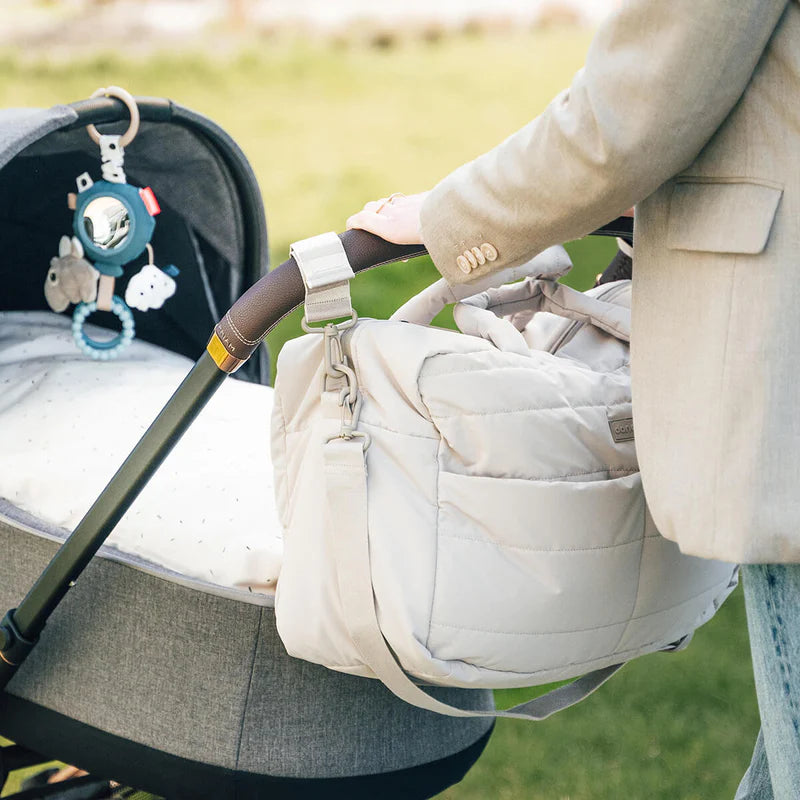 The bag has an insulated pocket inside to keep fluids hot or cold. The weatherproof surface protects your essentials from getting wet. The soft quilted changing bag and changing mat are designed in a nice soft colours. The straps on the outside makes it easy to attach the bag to the pram. The surface material is easy to wipe clean with a damp cloth.