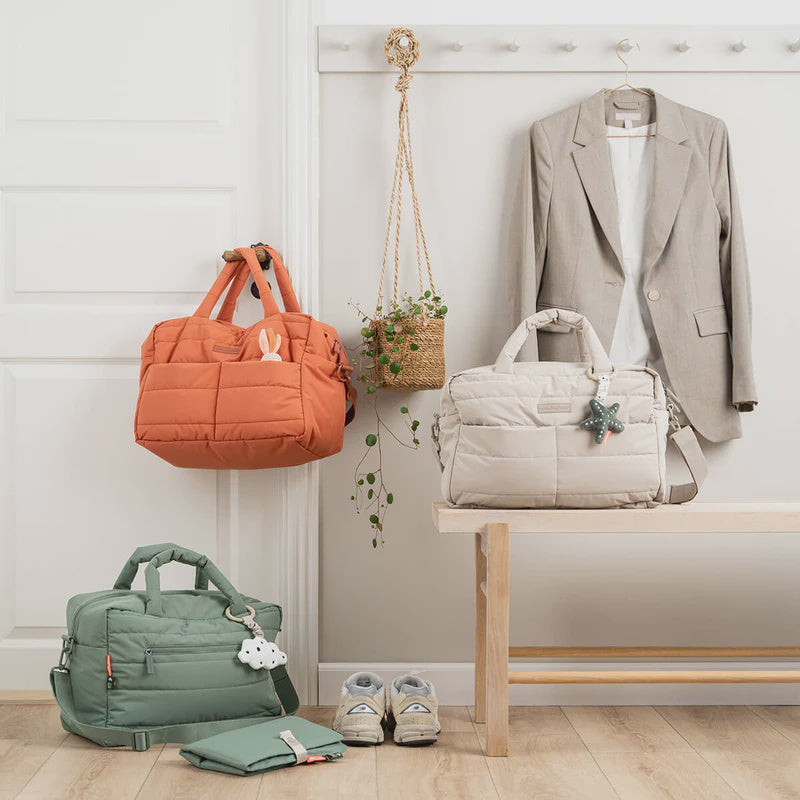 With this cool quilted changing bag you will have enough space to bring all you need for your little one and yourself. A practical changing mat is included, so don't worry when changing diapers on the go. It has pockets both on the inside and outside.