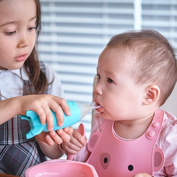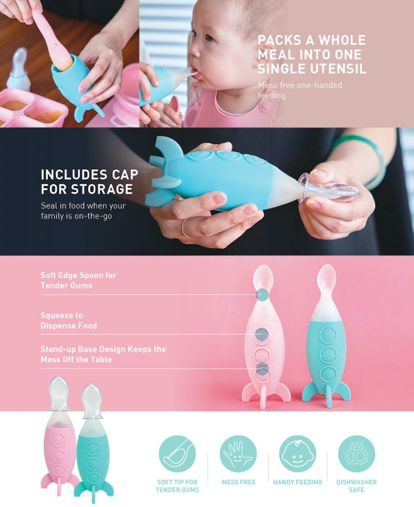 The rocket design attracts your little one’s attention while the spoon dispenses food one bite at a time with a squeeze. The stand-up base keeps the spoon off the table, so the spoon and the table stays clean. The included cap can be used to seal in food when your family is on-the-go. Choose from Pink or Blue.