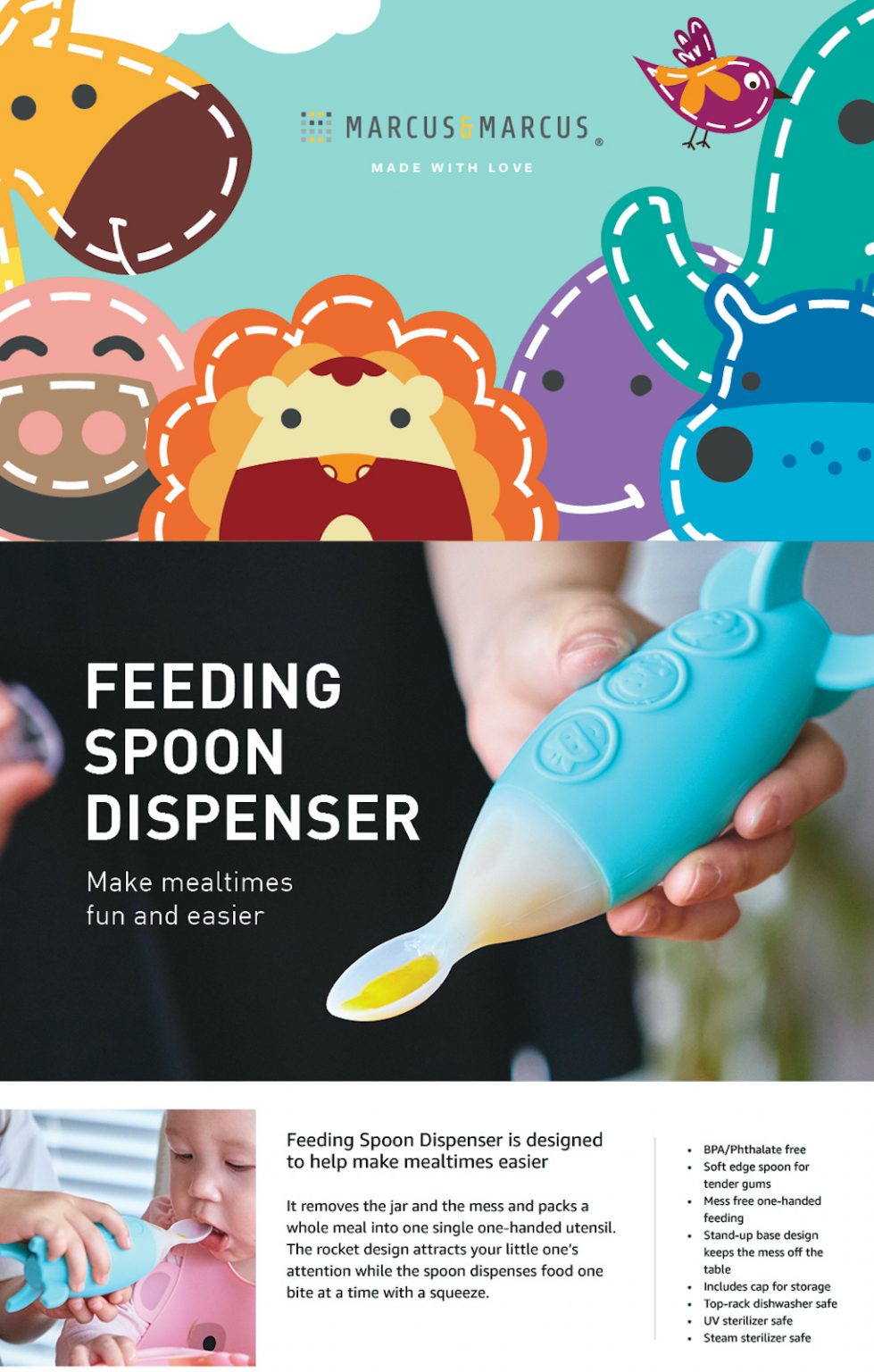 Feeding a baby is not always an easy task. That’s why Marcus & Marcus Feeding Spoon Dispenser is designed to help mealtimes easier. It removes the jar and the mess and packs a whole meal into one single one-handed utensil.