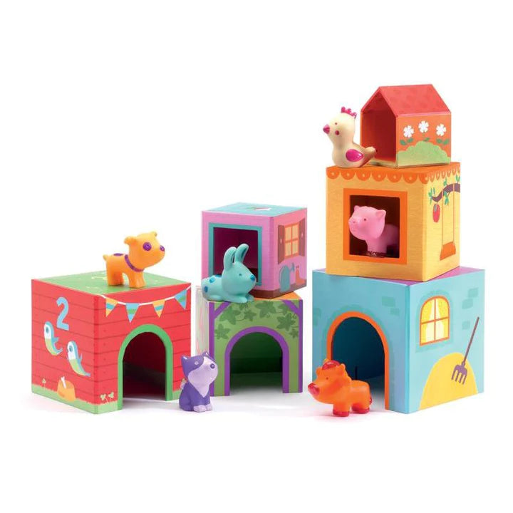 A vibrant stacking set for toddlers, featuring eco-friendly cardboard blocks adorned with charming farm animals and barns. These interlocking blocks not only enhance fine motor skills but also inspire imaginative storytelling. Djeco prioritizes safety and sustainability, making Topanifarm Blocks a delightful and enriching gift for young builders. Explore the joy of stacking, nesting, and imaginative play with this engaging farm-themed set.