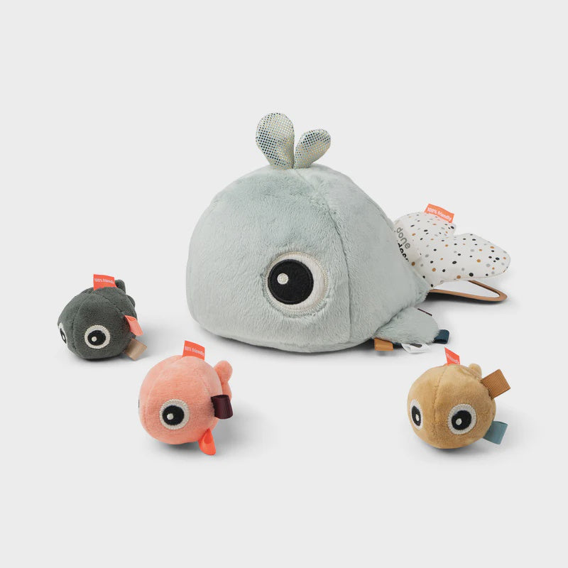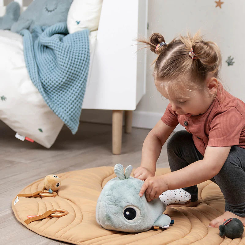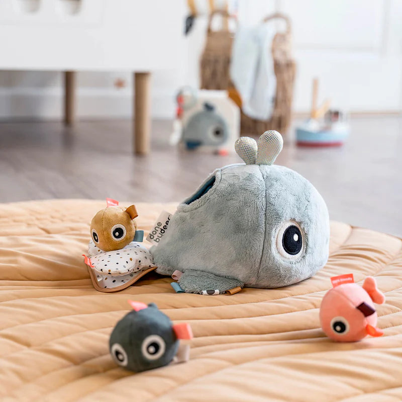 The playful whale loves to swim along and play hide and seek. Every fish has its own sound; bell, crinkle, chime and will encourage little ones to crawl after them if rolled. Little ones can solve how the cute round fish get in and out of Wally-s tummy, feel the different textures on the cute whale and discover a hidden mirror on Wally-s tale fin. The colourful tags and the cute water blow are a discovery treat. The hide and seek activity toy will entertain toddlers, while developing their concentration skills and hand-eye coordination.