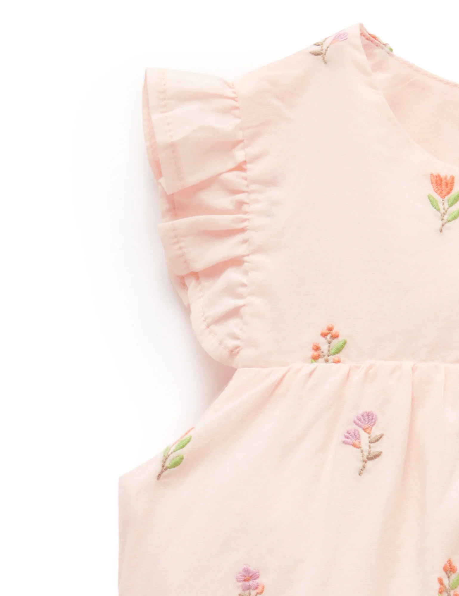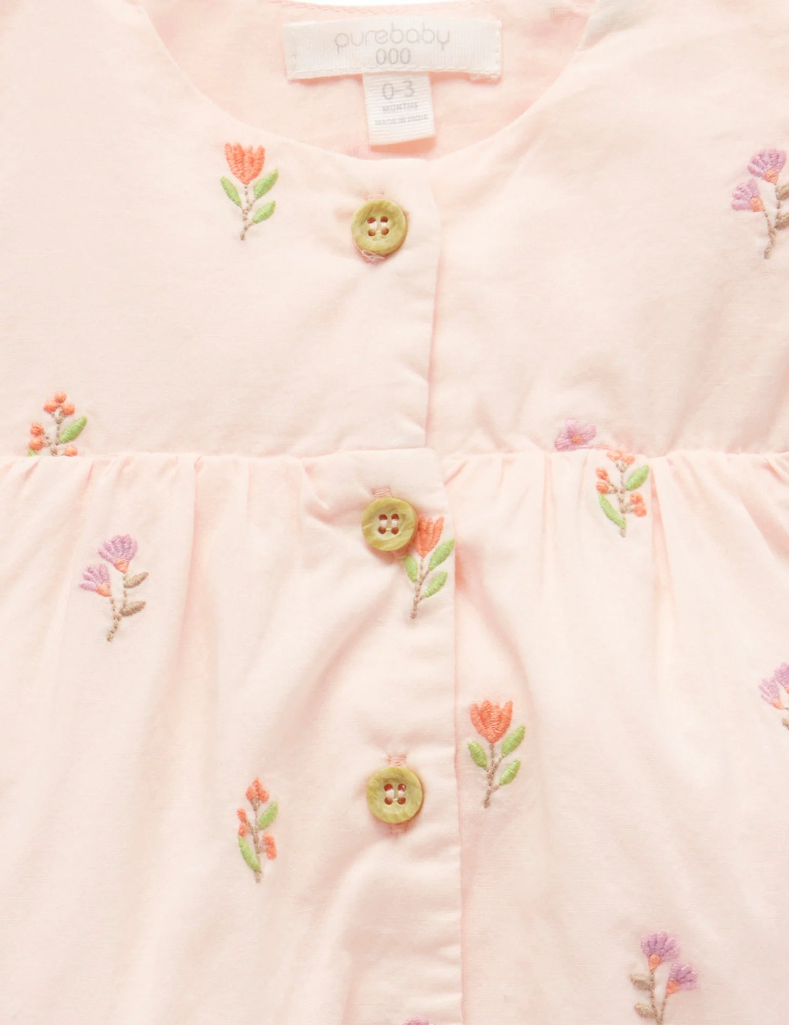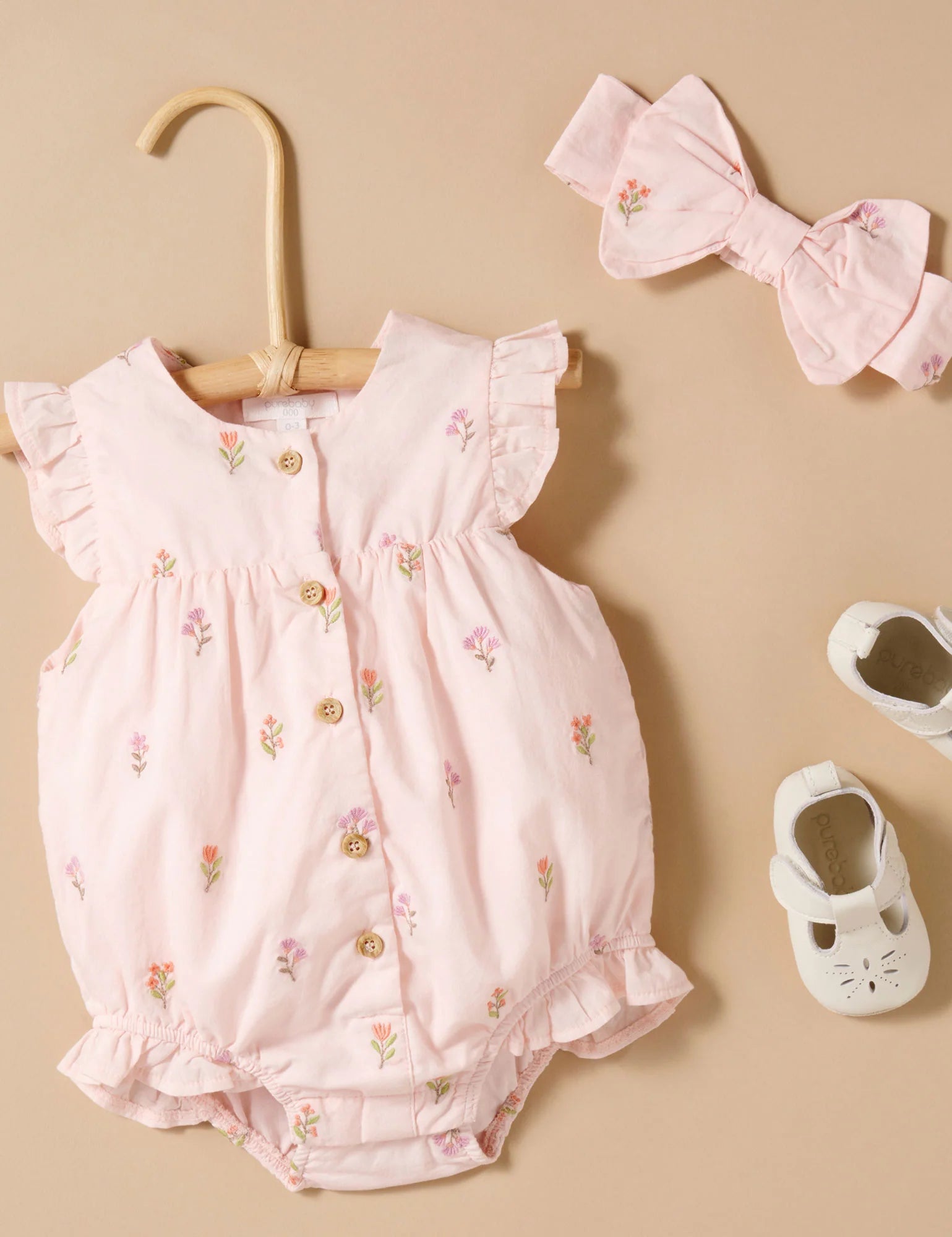 Our Sprig Embroidered Bodysuit is pretty all-in-one style for those hot summer days! Featuring ruffle details on the shoulders and legs, and a sweet all over floral embroidery. Made from the softest certified 100% Organic Cotton for a lightweight and breathable style. Style with our matching Floral Bow Headband for a cute outfit.
