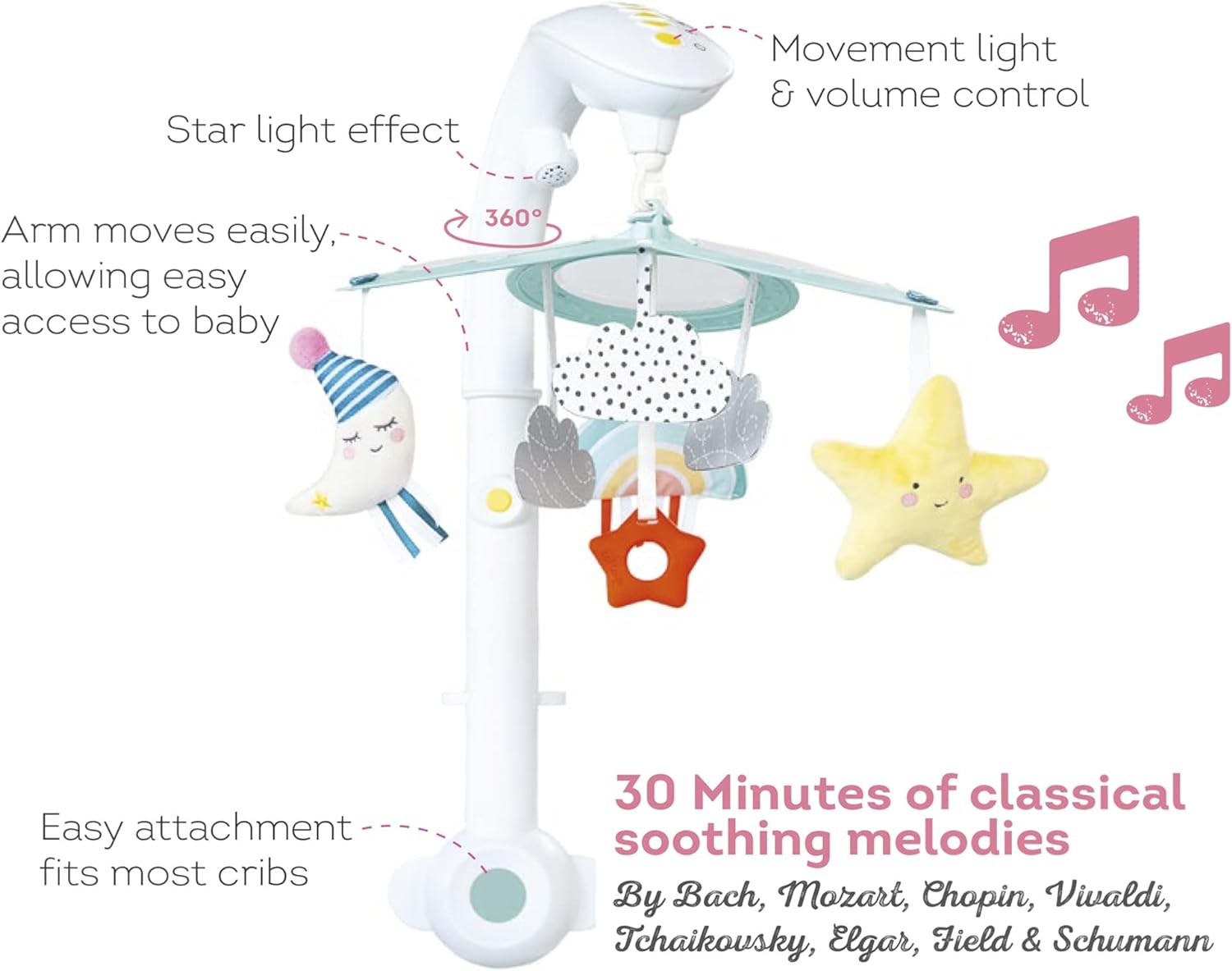 - Soothe your baby to sleep with up to 30 minutes of beautiful non-repeating classical melodies, especially edited for babies. This stylish cot mobile has a boutique look, which will fit perfectly into any modern nursery, whilst providing lots of fascinating sounds, movement and lights to captivate and stimulate your baby.