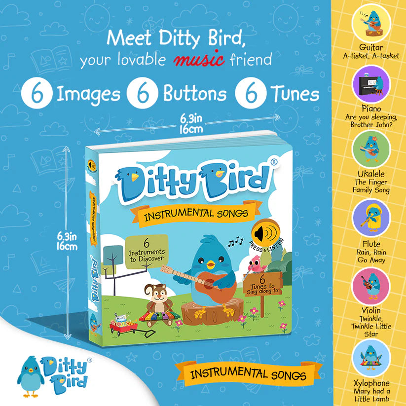 Turn storytime into a musical concert with Ditty Bird's Instrumental Songs sound book! Featuring six beloved children's songs played on various instruments, this book encourages active participation and auditory learning, making it an ideal choice for interactive play and musical exploration.