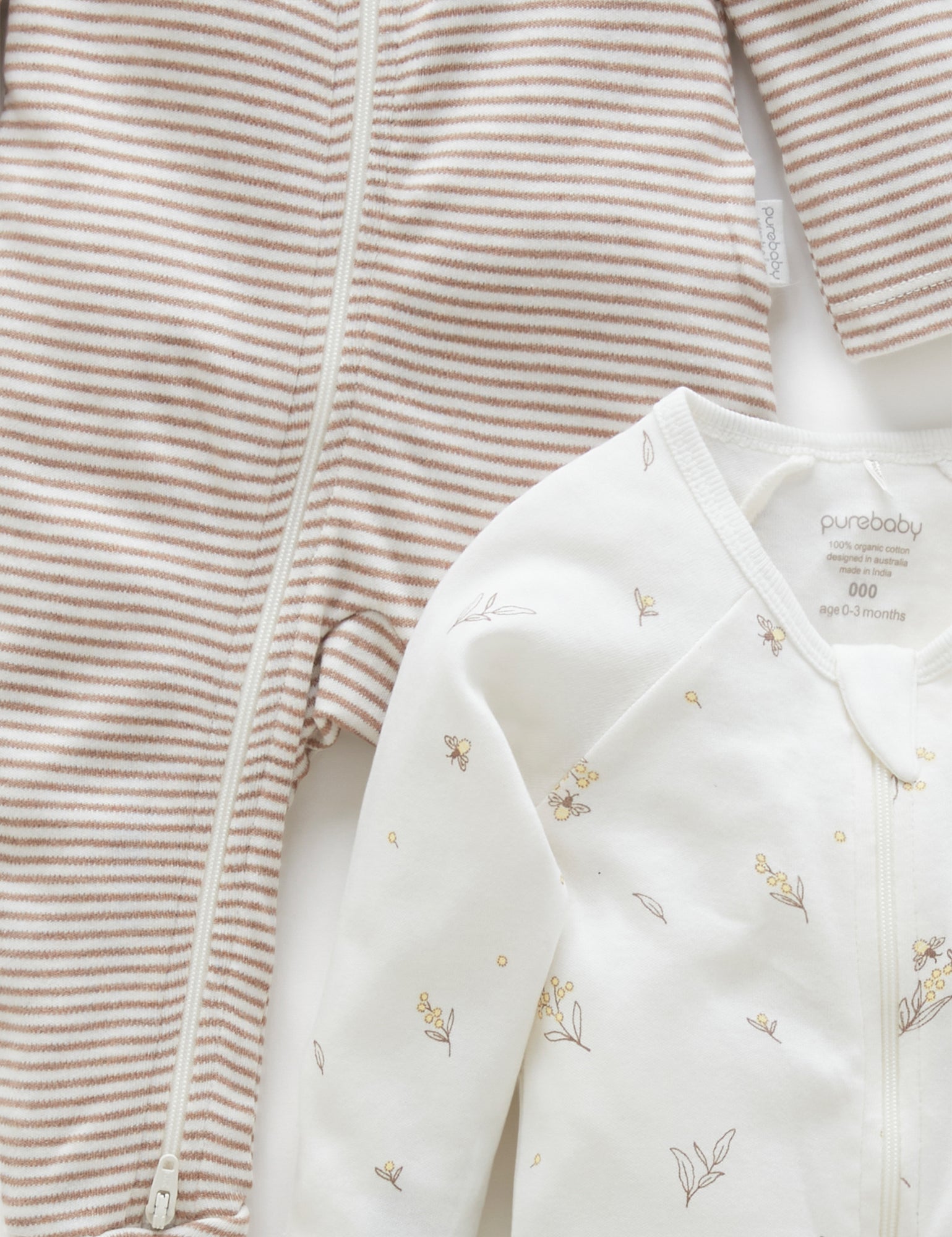 Our two pack Essentials Zip Growsuit designed for practicality and comfort. Featuring a full length double zip for the easiest of dressing. With long sleeves, inbuilt feet and optional turn-over mittens in sizes 0000-000, your newborn will be kept covered and warm. Made from the softest 100% Organic Cotton for a soft and gentle touch against your baby's delicate skin.