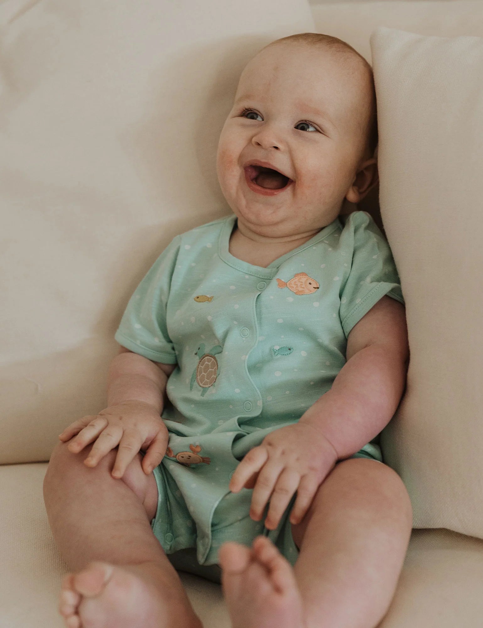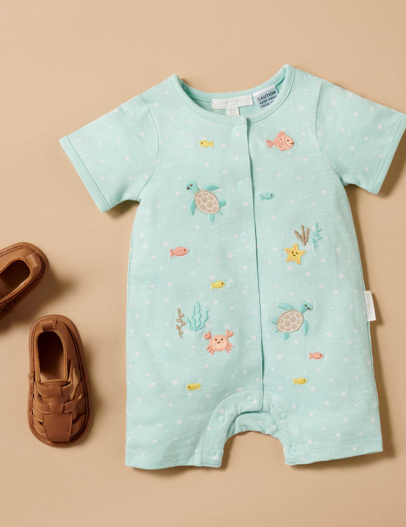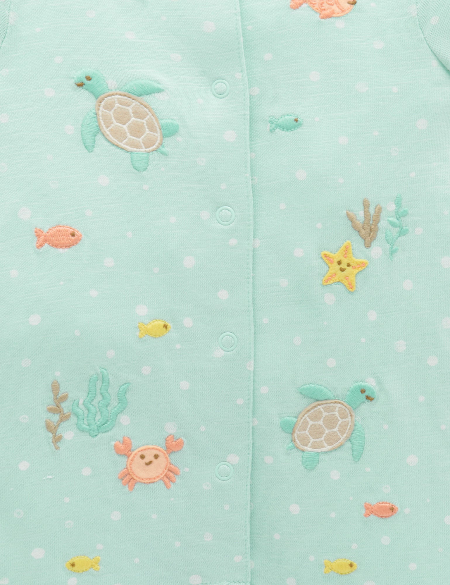 Our Under The Sea Growsuit is soft, easy wear style to keep your little one comfy and cool this summer. Printed with an all over bubble print, featuring fun underwater creature appliques on the front. Designed with snap clips down the body and leg for easy dressing. Made from our certified 100% Organic Cotton for the softest touch.