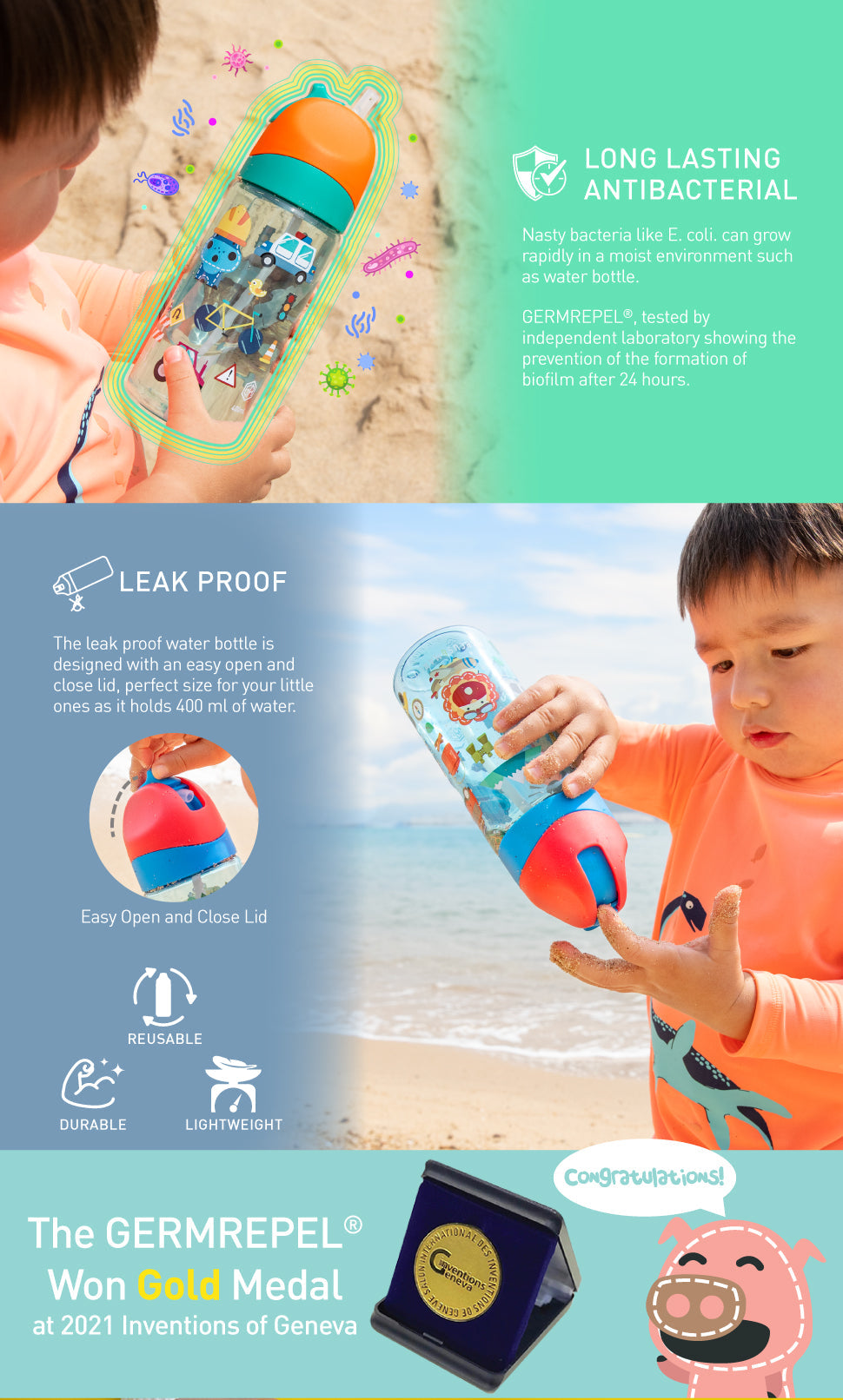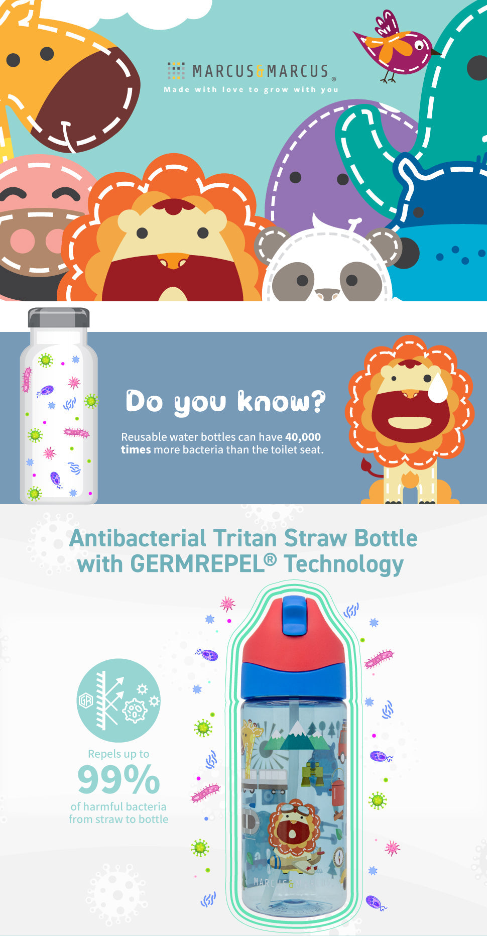 Keep your little ones hydrated with Marcus & Marcus Antibacterial Tritan Straw Bottle. This bottle has an easy open and close lid, and a perfect size that holds 400ml of water. The best part is that the bottle is made with GERMREPEL, a biocide free technology that repels up to 99% of harmful bacteria. This technology has been tested by an independent laboratory and proven to prevent the formation of biofilm after 24 hours. With Marcus & Marcus, you can trust that your little ones are drinking from a high quality and leak proof straw bottle.