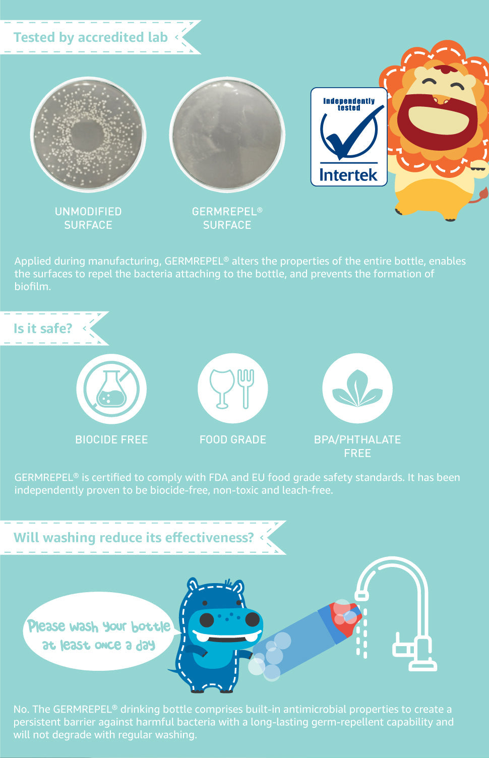 - Repels up to 99% of harmful bacteria from straw to bottle