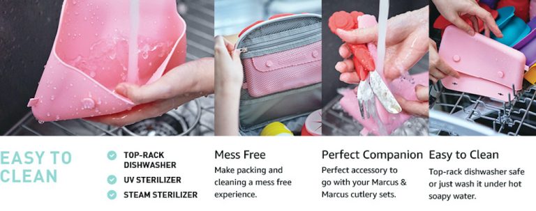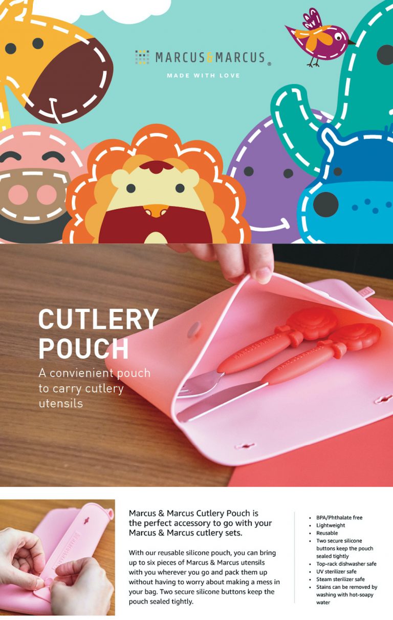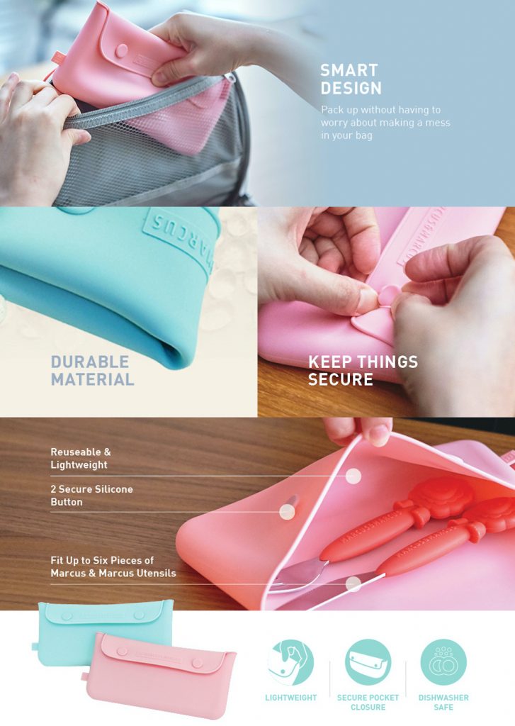 Marcus & Marcus’ cutlery pouch is the perfect accessory to go with your Marcus & Marcus cutlery sets. With our reusable silicone pouch, you can bring up to six pieces of Marcus & Marcus utensils with you wherever you go and pack them up without having to worry about making a mess in your bag.
