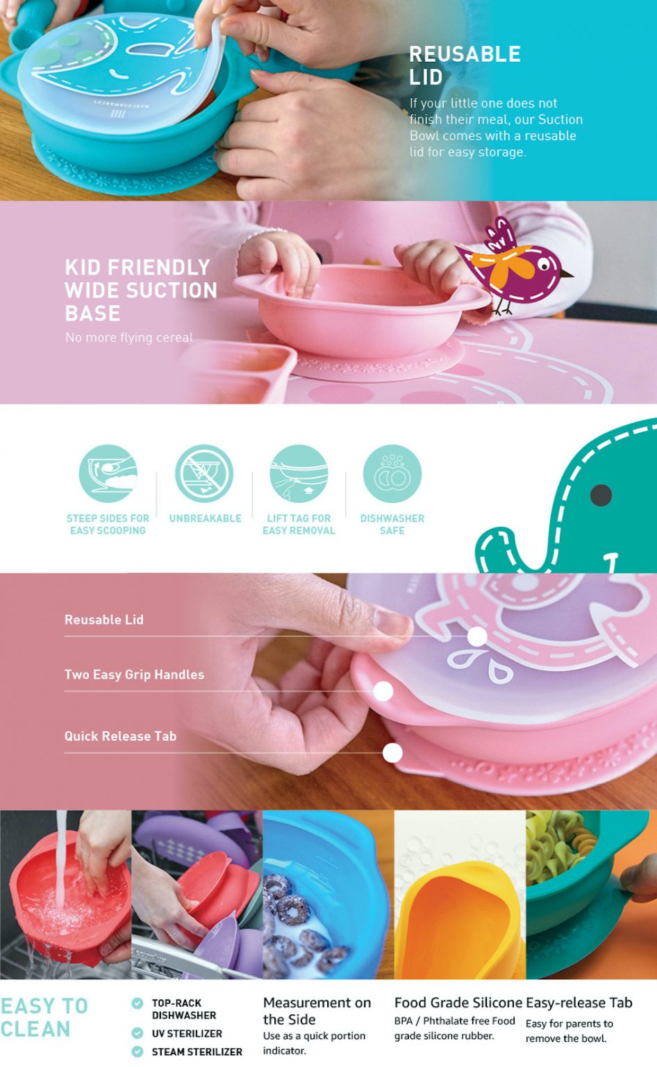 If your little one does not finish their meal, our Suction Bowl comes with a reusable lid for easy storage. Our suction bowls are made of BPA and phthalate free food grade silicone and are microwave safe and freezer safe.