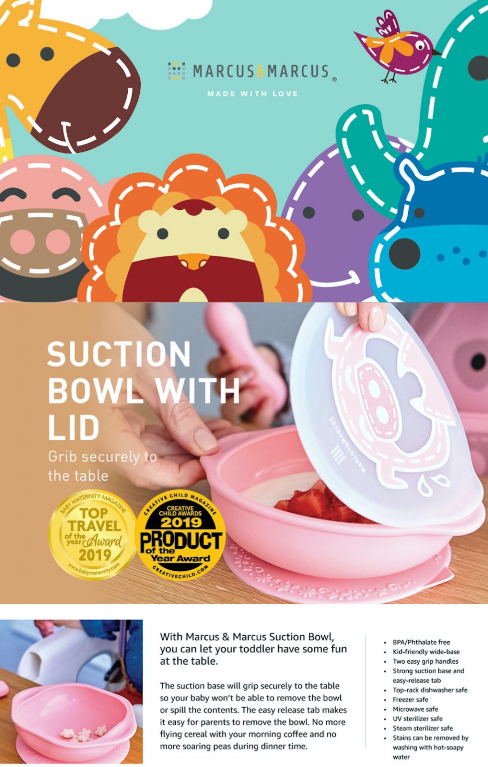 With Marcus & Marcus’ Suction Bowl With Lid, you can let your toddler have some fun at the table. Just place the bowl directly on the table and the suction base will grip securely to the table. The easy release tab makes it easy for parents to remove the bowl. No more flying cereal with your morning coffee, and no more soaring peas during dinner time.