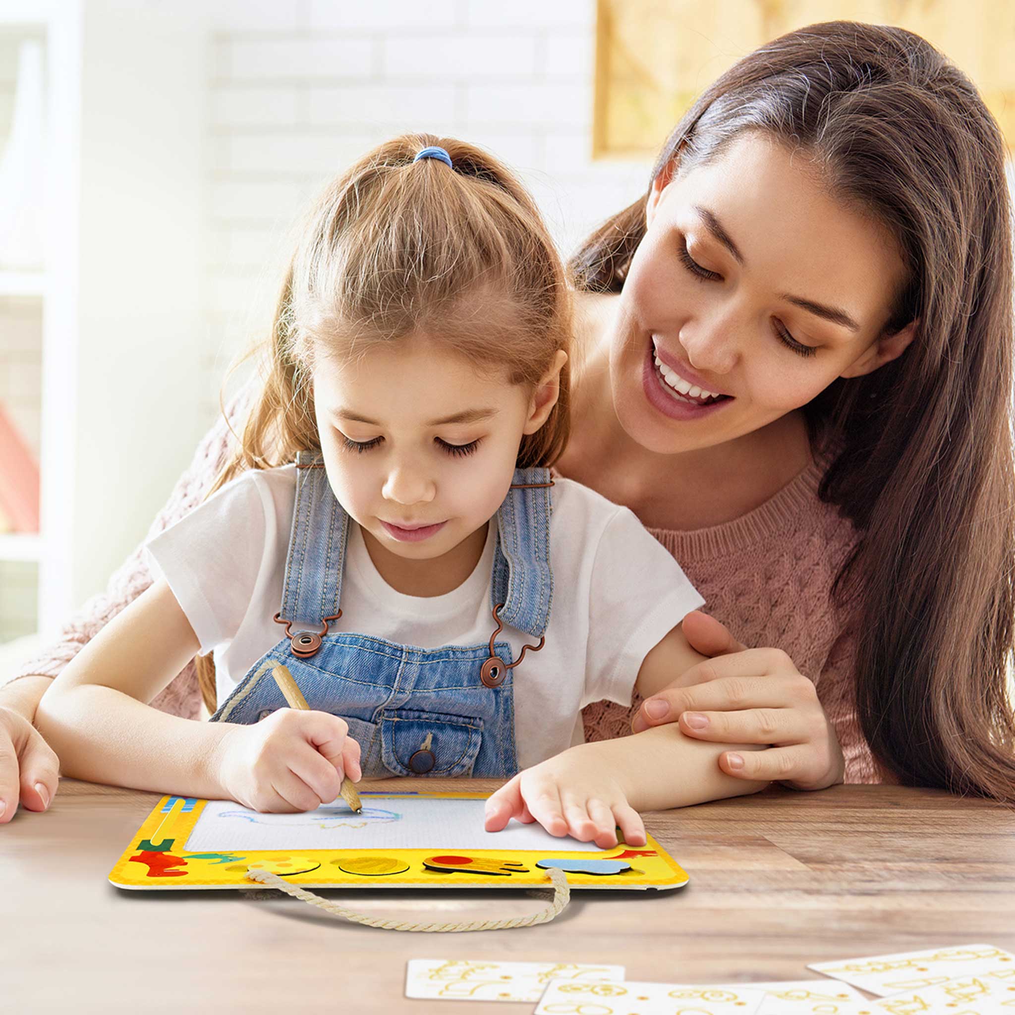 - Includes: 1 drawing board | 20 step-by-step cards | 4 stencils | 4 magnetic stamps | 1 wooden pencil