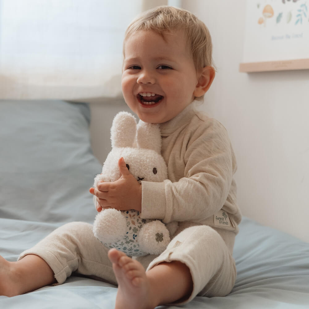 Ready for a cuddle? This Miffy is waiting for a cuddle and hug. She is incredibly soft and has the perfect size to go everywhere. Cuddly Miffy is made of soft plush and printed corduroy and stands at 22cm tall. She is dressed in Lucky Leaves print, a Little Dutch design. An iconic bunny that no nursery can do without.