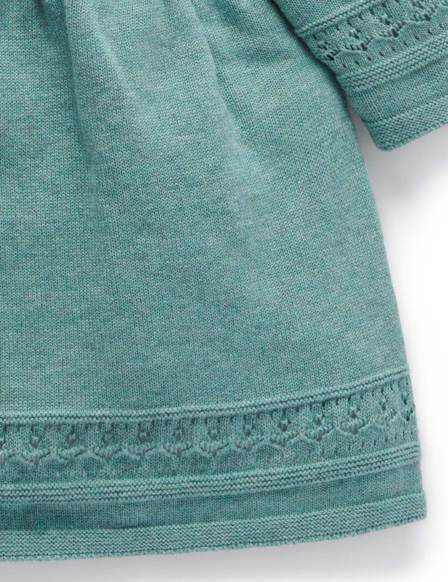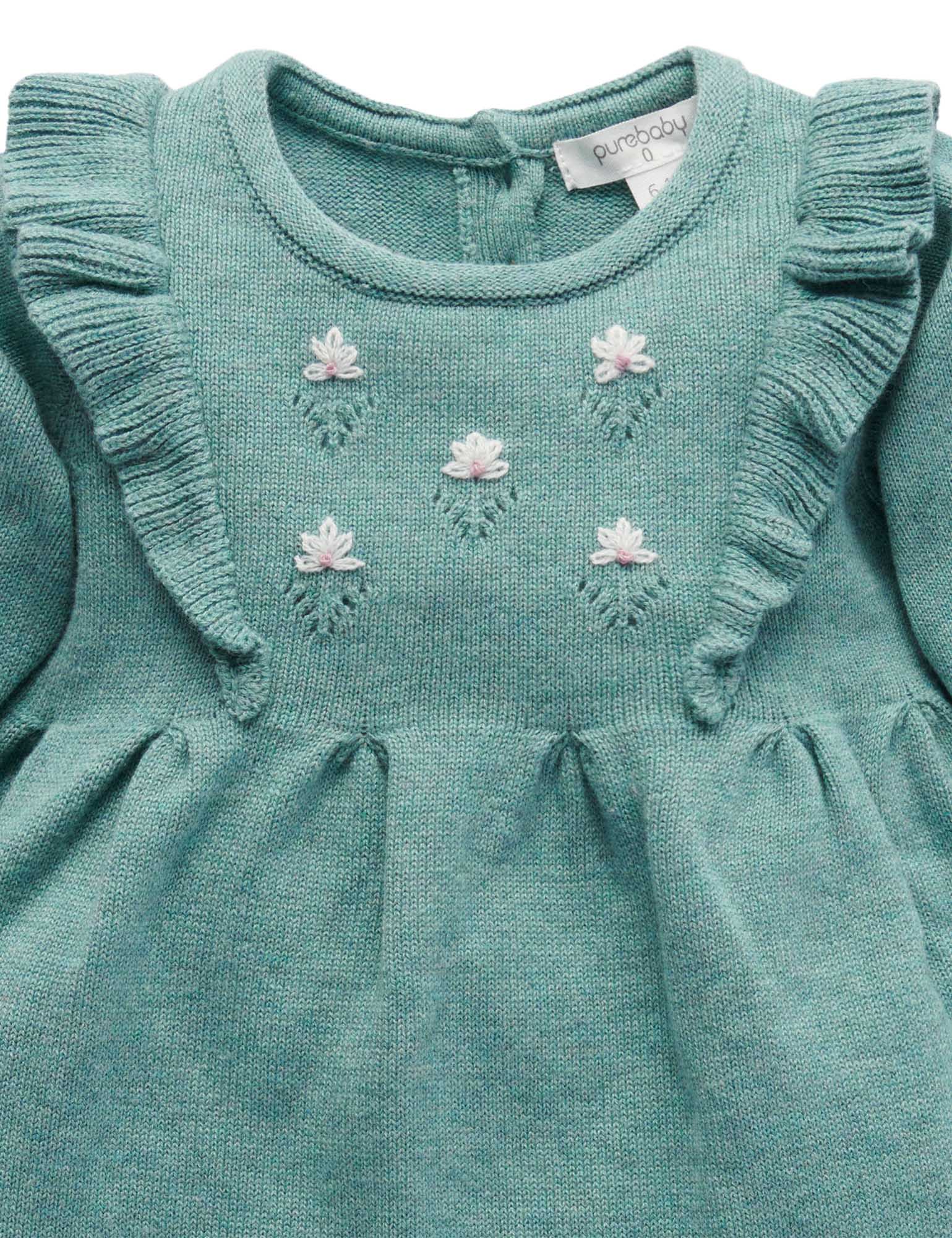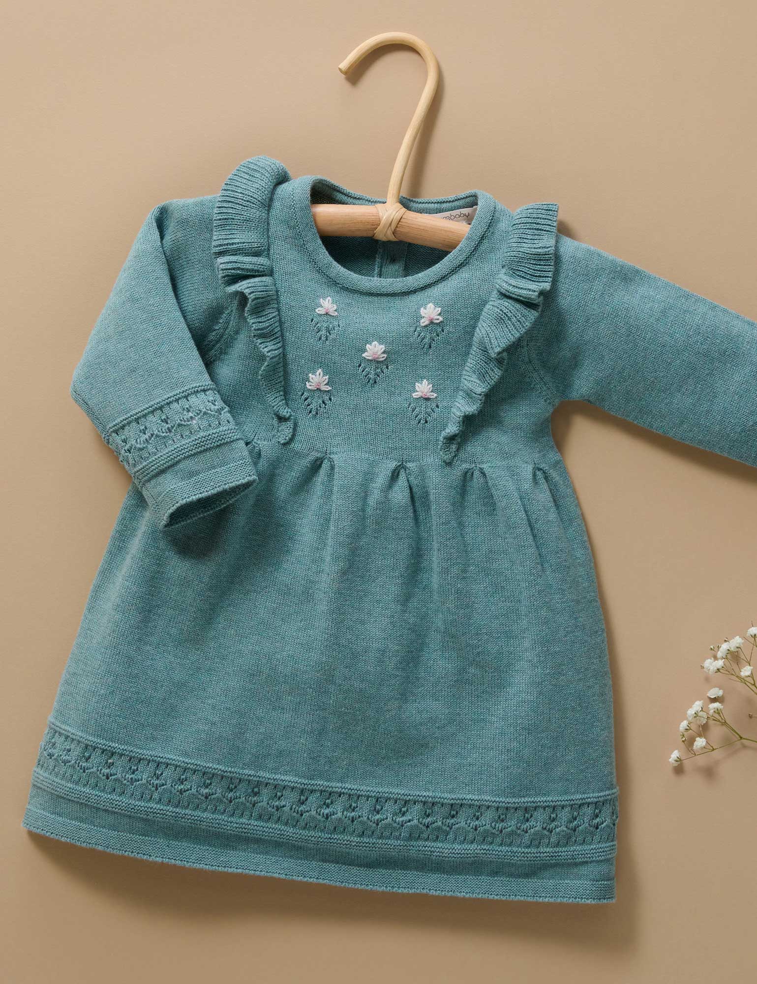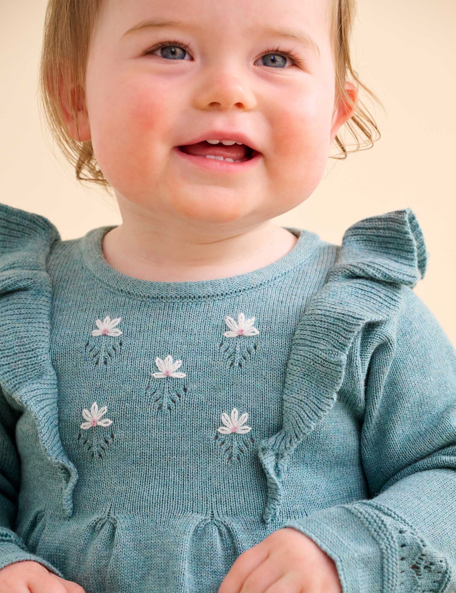 Our Primrose Knitted Dress is sweet style, ideal for layering with tights on those chillier days. Featuring a beautiful floral hand embroidery on the chest, ruffle detail and knitted eyelet border on the cuffs and hem. Made from an organic cotton and wool blend to keep your little one warm and cosy.