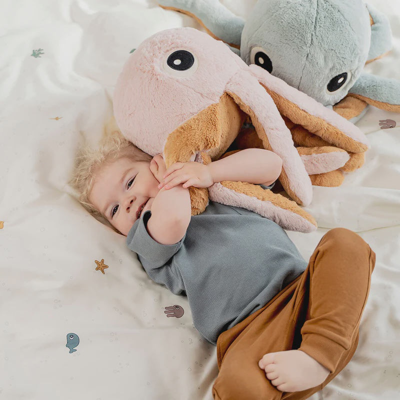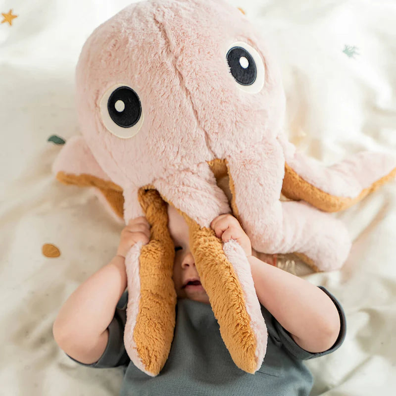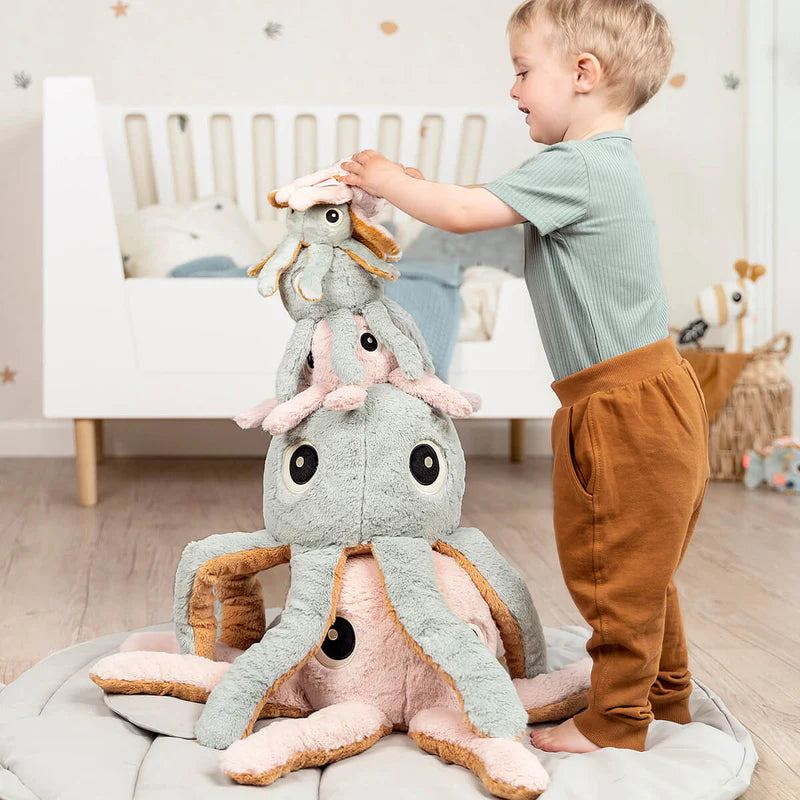 Jelly is a forever helpful friend who is always ready to give you a hand - or seven. When it is time to cuddle up and go to sleep Jelly will provide endless hugs with its many arms. The cute and cuddly jellyfish will be a loyal companion during playtime and a safe friend to hold hands with at sleepovers. The super soft and fluffy jellyfish soft toy has a light blue tone on the outside and a warm mustard shade on the inside.