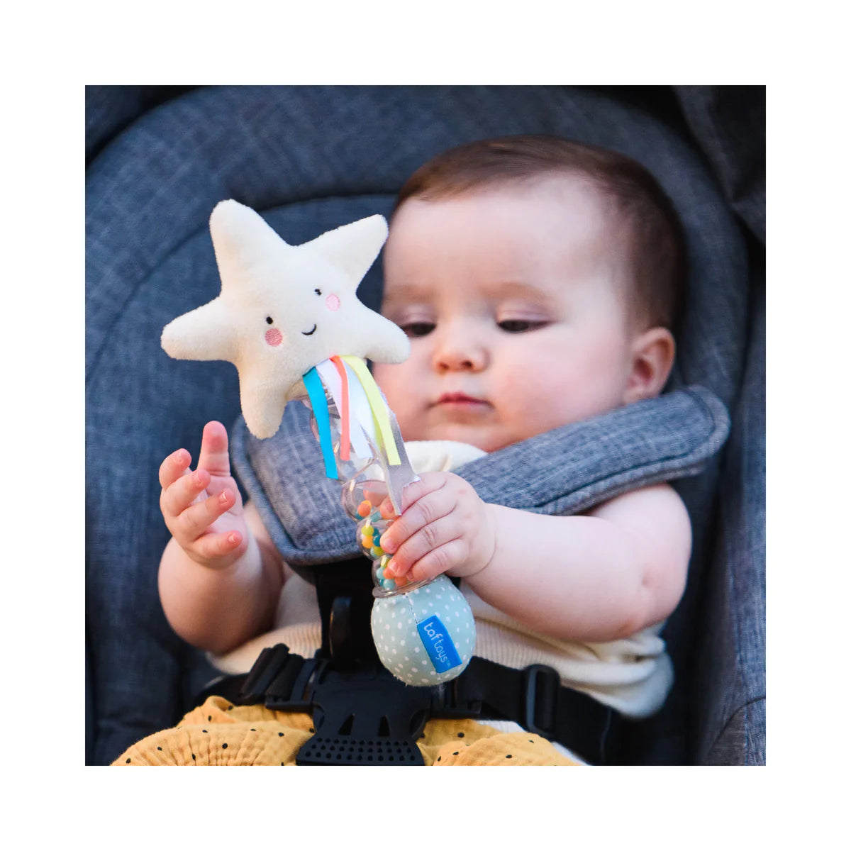 Taf toys Star Rainstick rattle provides soothing raindrop sounds little ones will love. With a plush star and colorful ribbons for tactile exploration all part from our Mini Moon collection. Designed for little hands for an easy grip with a transparent stick to enhance the magical calm feeling you have while watching & listening to the falling beads with those relaxing sounds. The Taf toys Star Rainstick rattle engage visual, auditory, and tactile senses. Gripping, shaking, and tracking the beads develops coordination, engagement of mental skills, and building of fine and gross motor skills. Keeps your baby happy and busy while developing.