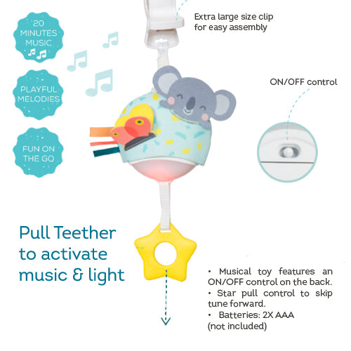 • My Musical Koala toy offers babies an excellent opportunity to further their understanding of cause and effect. By pulling the toy’s teether, Baby prompt the music to start & the light will chance his color supports this cognitive understanding, which gradually helps them realize that they have control and can actually make things happen.