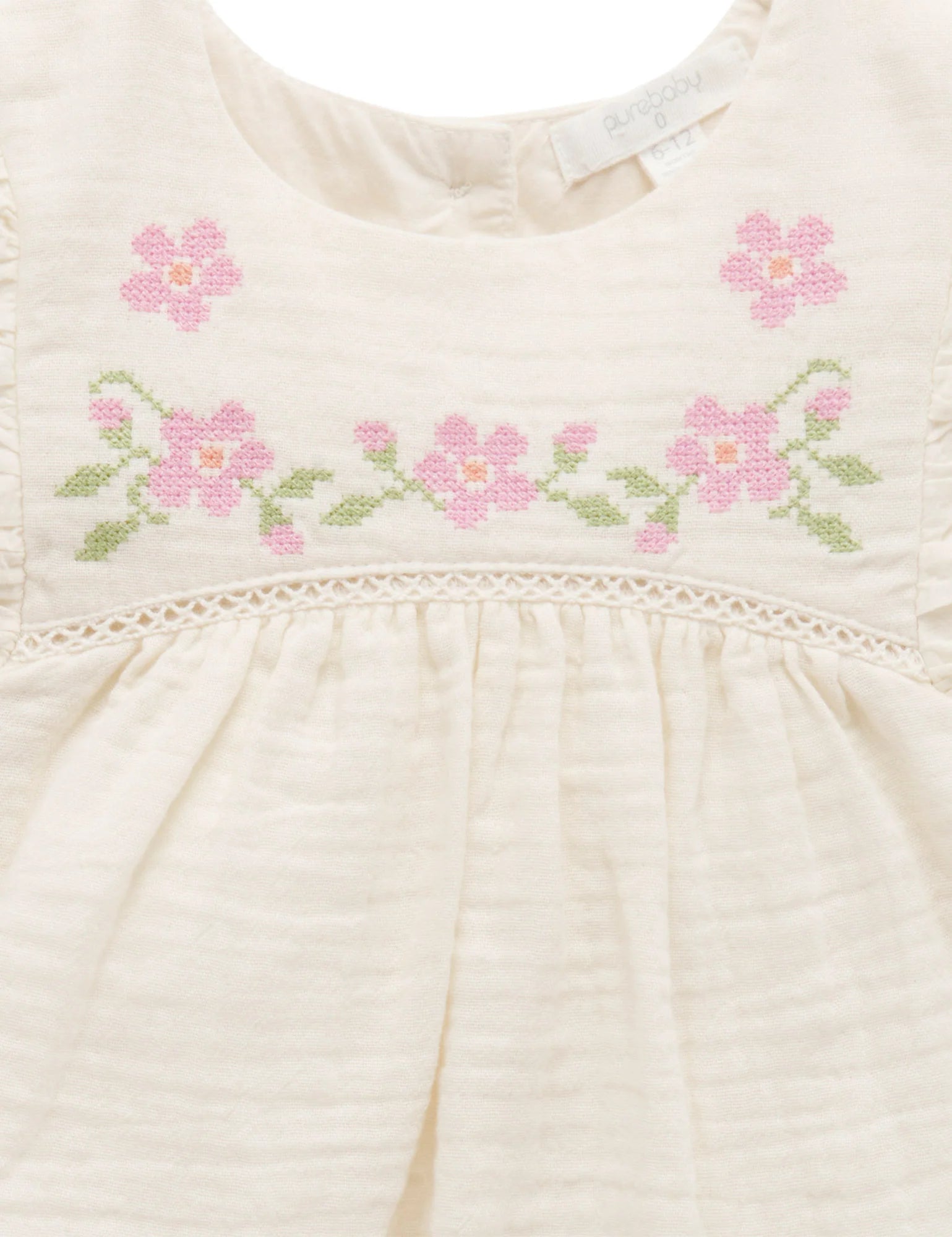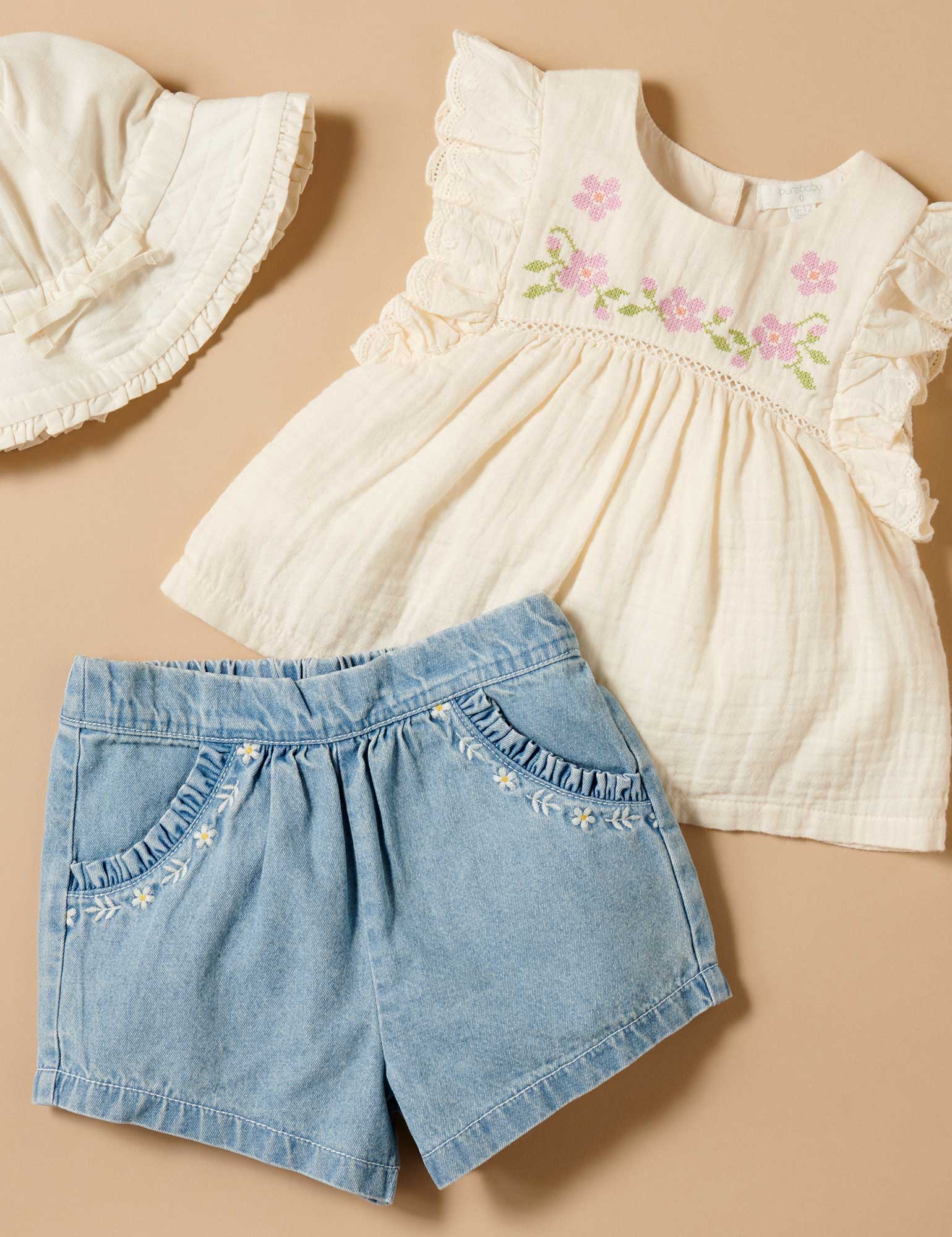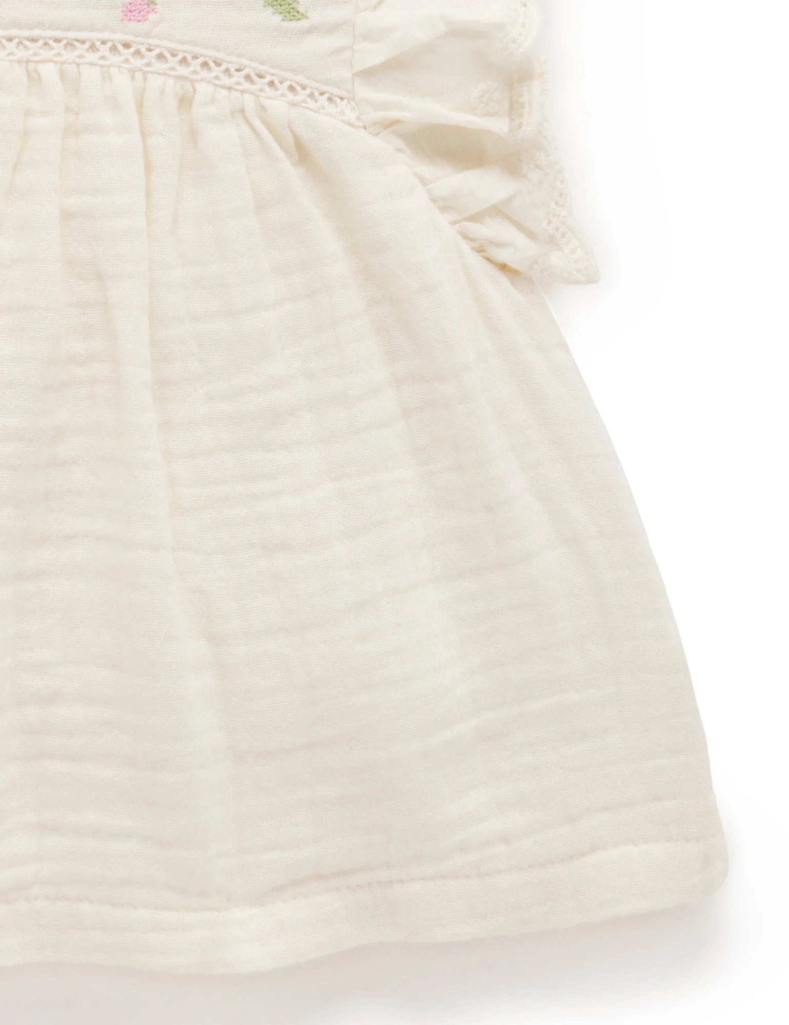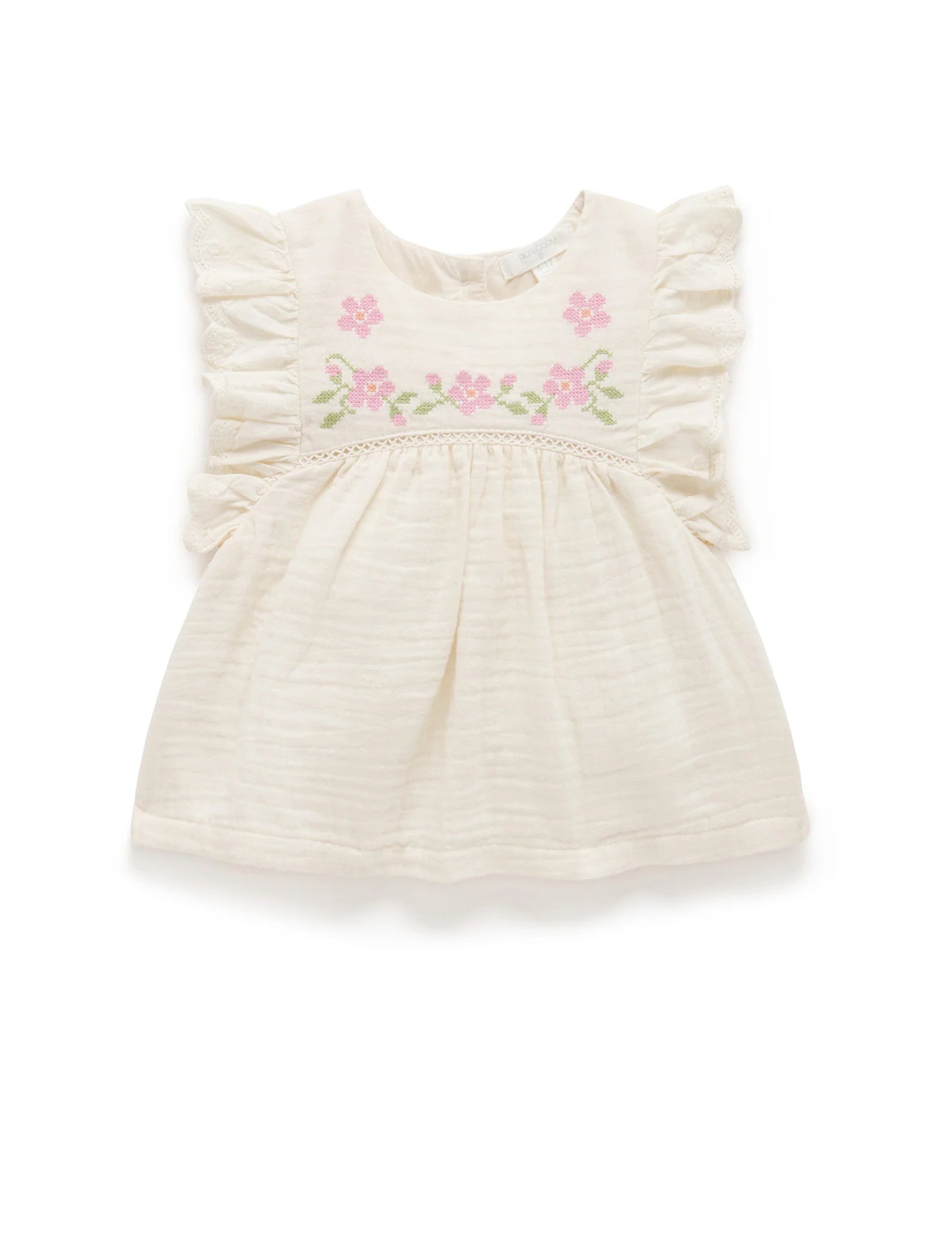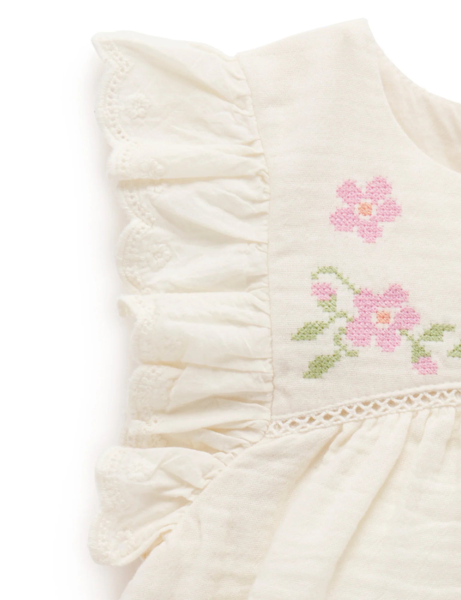 Our pretty Embroidered Ruffle Top is the perfect tee for those special occasions. Featuring a sweet floral cross stitch embroidery at the yoke and flutter sleeves. Made from the softest certified 100% Organic Cotton muslin, for a lightweight top. Pair with our denim Ruffle Shorts for a pretty outfit.