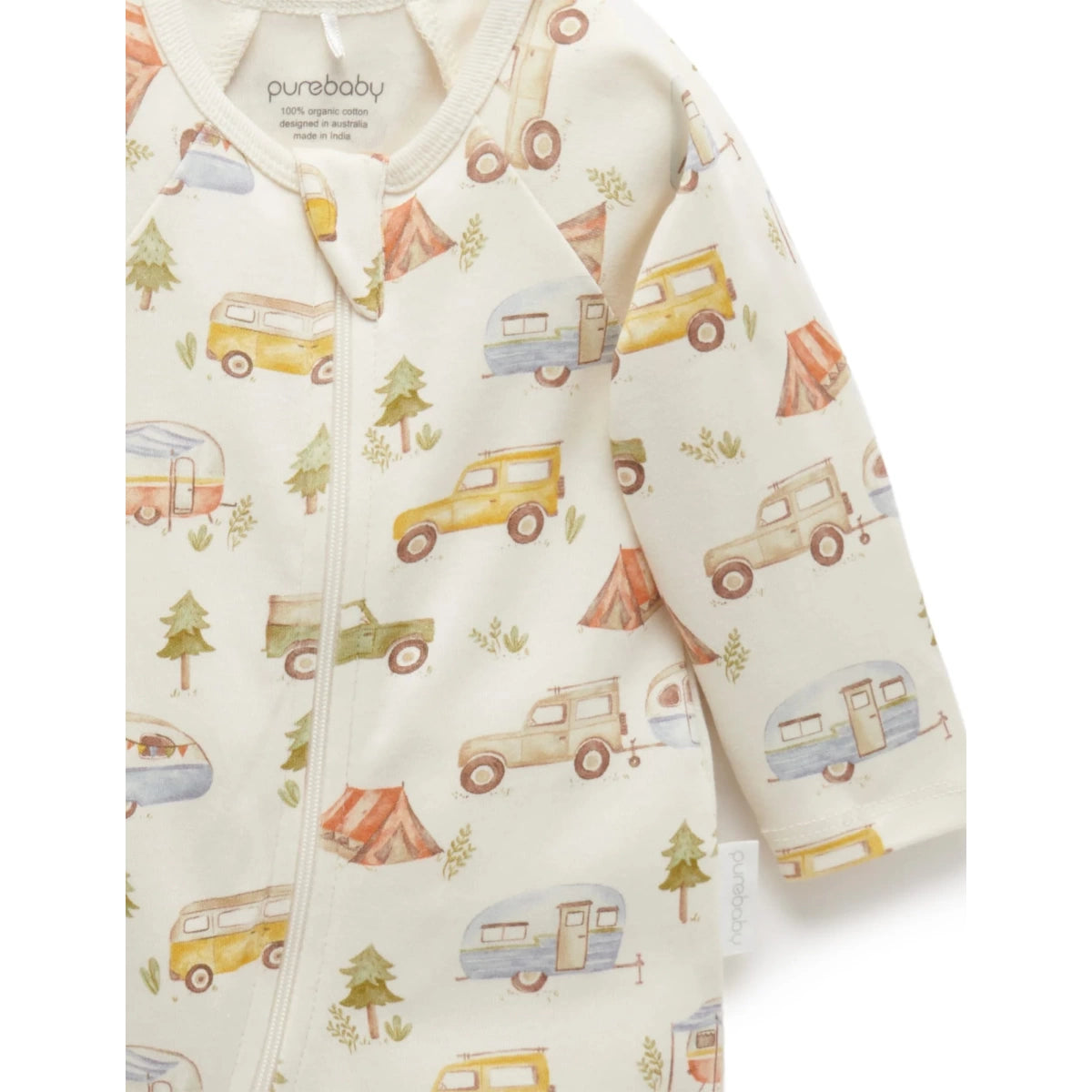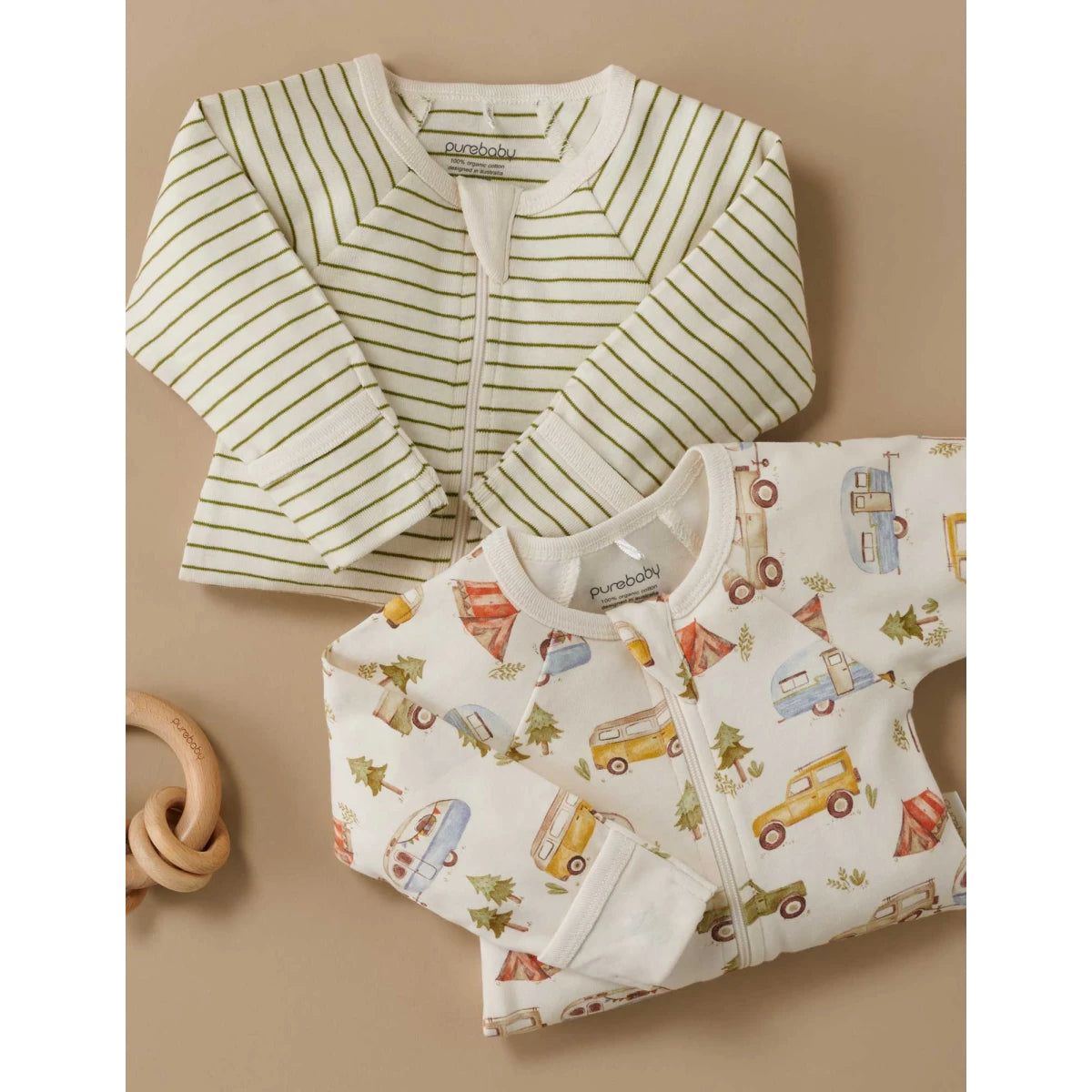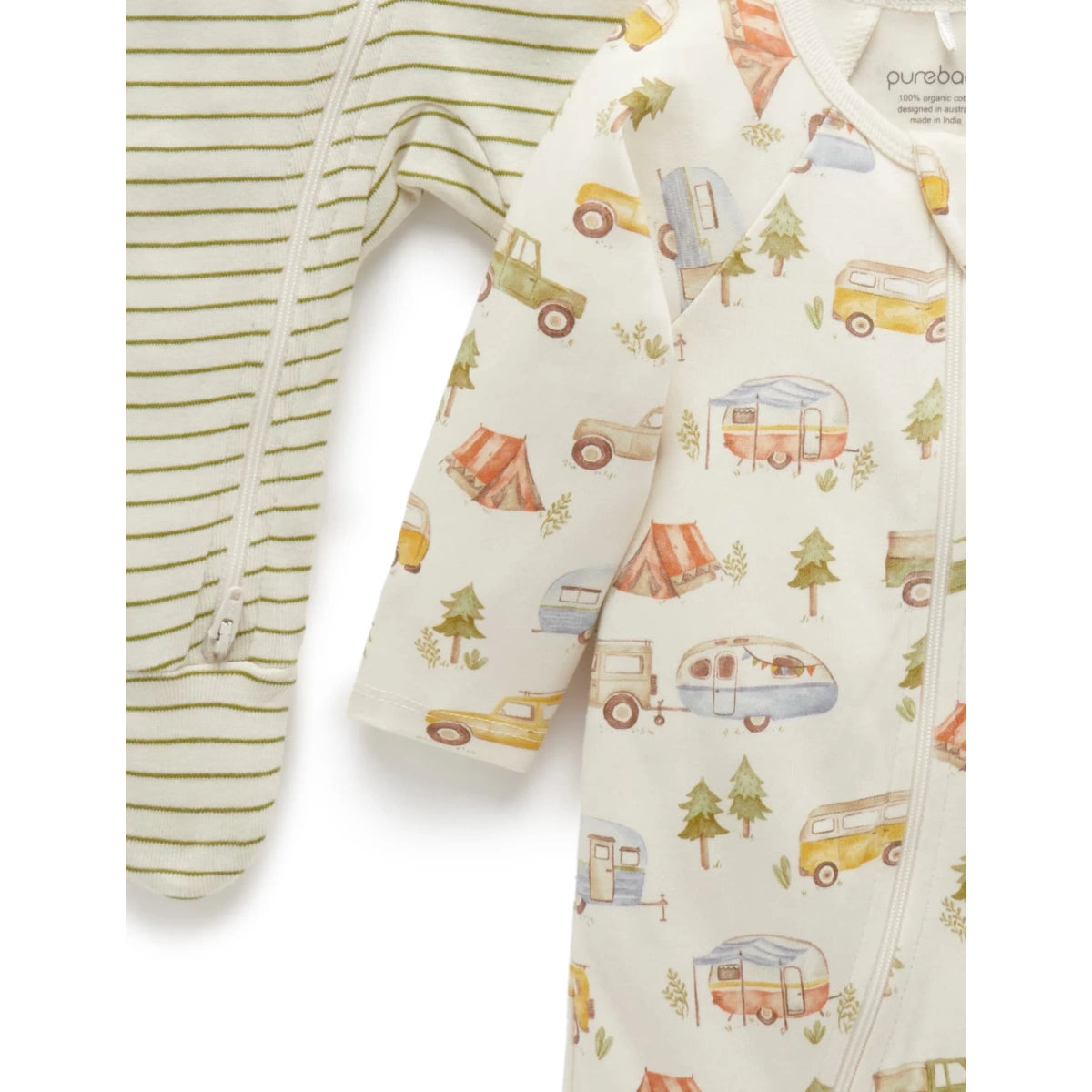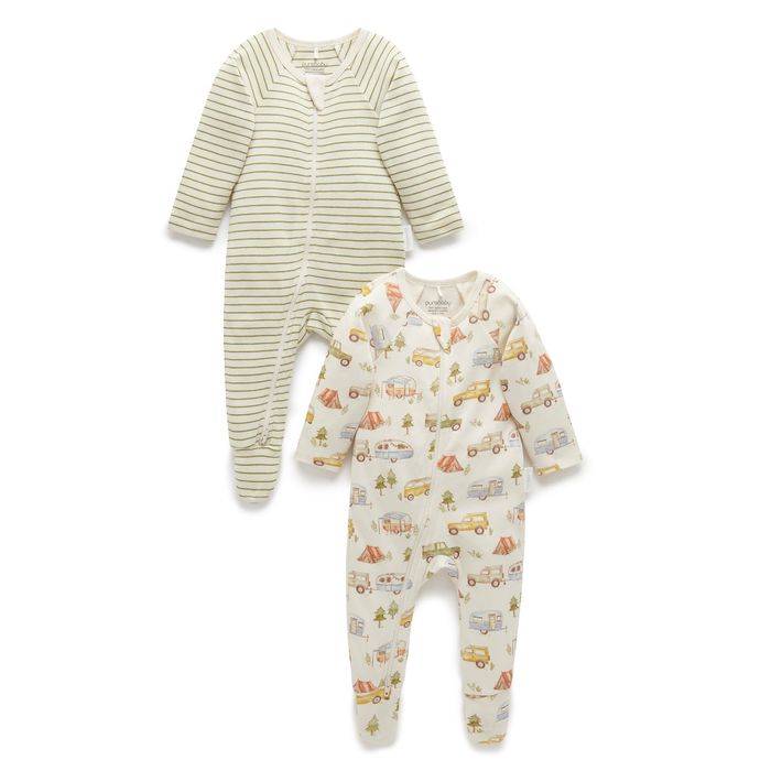 Our best selling Zip Growsuit, now available in limited edition prints! Our 2 Pack Zip Growsuit features one limited edition growsuit in a Purebaby illustrated print and a second striped growsuit.