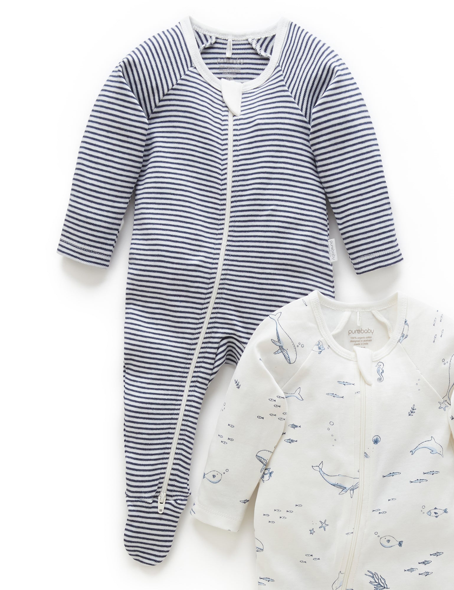Our two pack Essentials Zip Growsuit designed for practicality and comfort. Featuring a full length double zip for the easiest of dressing. With long sleeves, inbuilt feet and optional turn-over mittens in sizes 0000-000, your newborn will be kept covered and warm. Made from the softest 100% Organic Cotton for a soft and gentle touch against your baby's delicate skin.