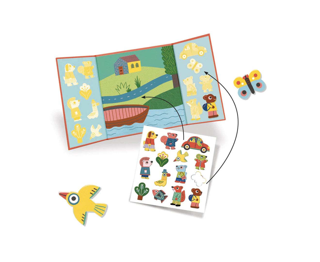 A folder with a gorgeous illustration that toddlers and preschoolers can decorate with repositionable thick animal stickers. Little fingers can easily peel and restick the sets while on to go, on a plane and in the car. Allows for experimentation with different textures, patterns and volumes. Offers the opportunity to discuss different animals and experiment with storytelling.