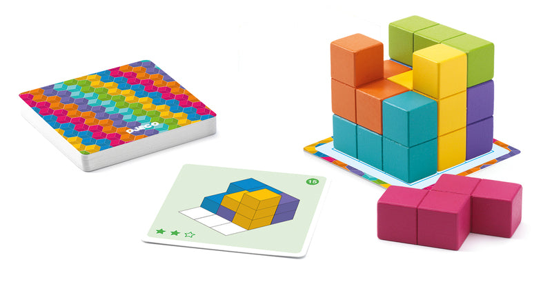 Aim of the game: Recreate the cubes with the provided wooden pieces.