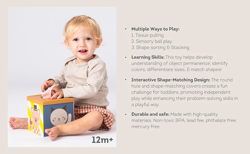 - Features x5 vibrant chiffon tissues, 3 play balls and 8 stackable shapes. The play and discover cube promote cognitive growth and motor skill development through interactive play.