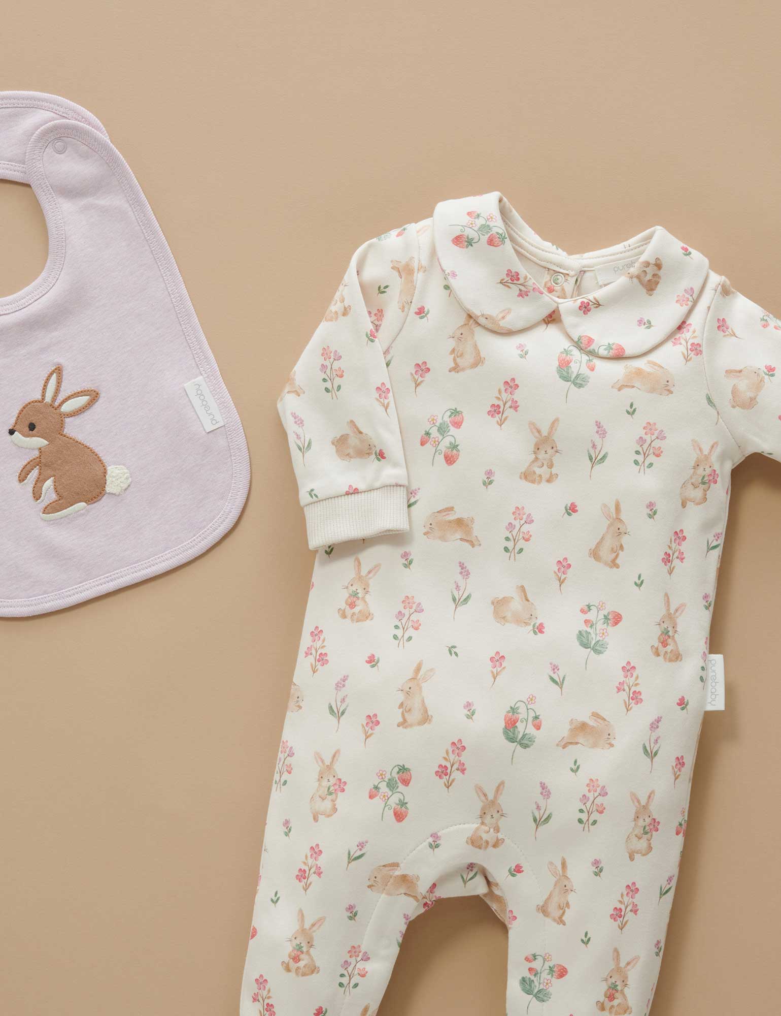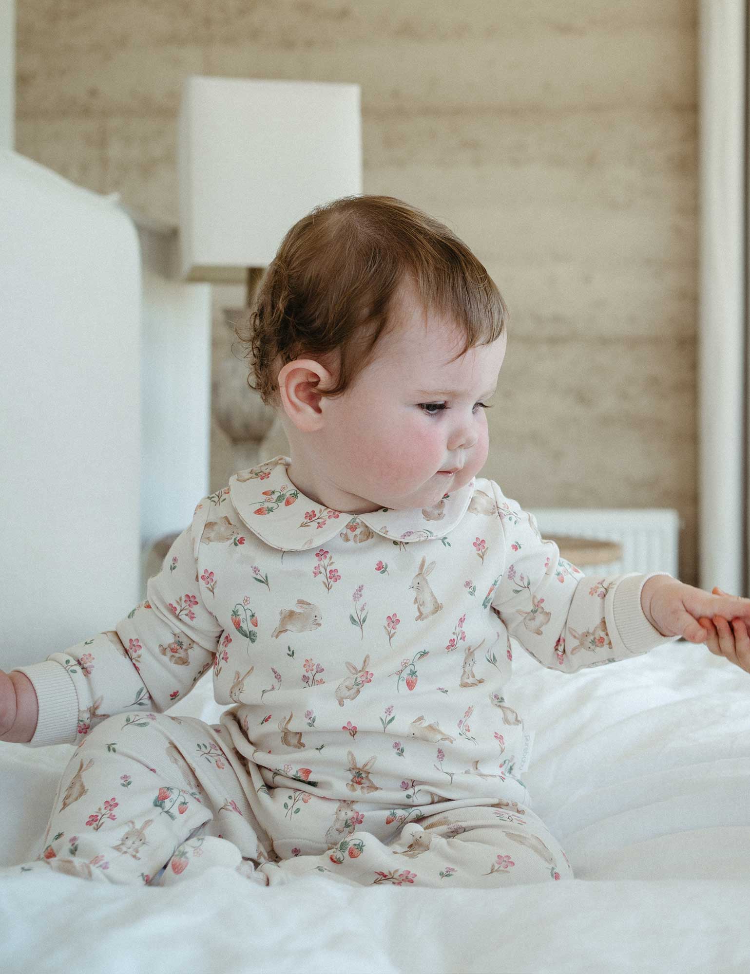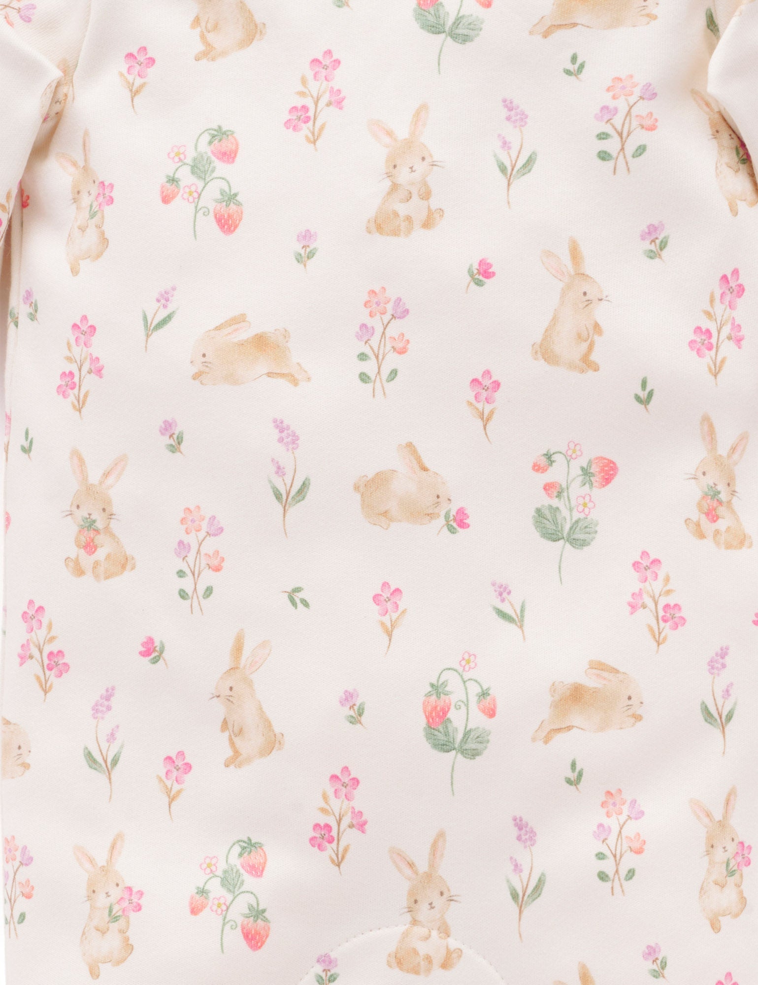 Our Thick Bunny Growsuit is a sweet and practical style! Featuring a pretty all over watercolour print of bunnies and flowers, with a rounded collar and snap clips at the leg and back for easy dressing. Made from a thick 100% Organic Cotton interlock to keep your little one warm in the cooler months.